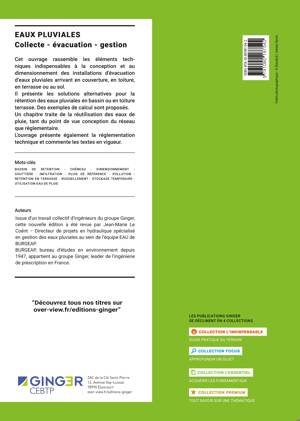 Cet ouvrage rassemble les éléments techniques indispensables à la conception et au dimensionnement des installations d'évacuation d'eaux pluviales arrivant en couverture, en toiture, en terrasse ou au sol. Il présente les solutions alternatives pour la rétention des eaux pluviales en bassin ou en toiture-terrasse. Des exemples de calculs sont proposés. Un chapitre traite de la réutilisation des eaux de pluie, tant du point de vue conception du réseau que réglementaire. L'ouvrage présente également la réglementation technique et commente les textes en vigueur.