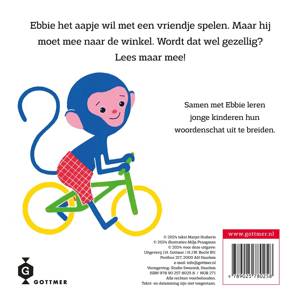 In de boekjes over het aapje Ebbie maken peuters op een leuke manier kennis met diverse leerconcepten. 'Ebbie doet boodschappen' is een van de zes boekjes in deze unieke serie die spelenderwijs bijdraagt aan het uitbreiden van de woordenschat. Door middel van eenvoudige dialogen kunnen peuters met Ebbie mee op zijn kleine avontuurtjes in vrolijke kleuren. Deze keer gaat Ebbie met de fiets naar de supermarkt om boodschappen te doen.