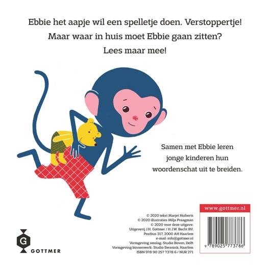'Ebbie speelt verstoppertje' is het derde deeltje in de reeks kartonboekjes voor peuters over het vrolijke aapje Ebbie. Leer nieuwe woorden en concepten kennen met de gezellige Ebbie, die nog lang niet wil slapen.