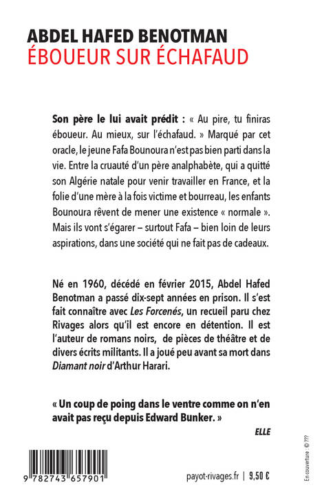 Son père le lui avait prédit : "Au pire, tu finiras éboueur. Au mieux, sur l'échafaud." Marqué par cet oracle, le jeune Fafa Bounoura n'est pas bien parti dans la vie. Entre la cruauté d'un père analphabète, qui a quitté son Algérie natale pour venir travailler en France, et la folie d'une mère à la fois victime et bourreau, les enfants Bounoura rêvent de mener une existence "normale". Mais ils vont s'égarer - surtout Fafa - bien loin de leurs aspirations, dans une société qui ne fait pas de cadeaux. Né en 1960, décédé en février 2015, Abdel Hafed Benotman a passé dix-sept années en prison. Il s'est fait connaître avec "Les Forcenés", un recueil paru chez Rivages alors qu'il est encore en détention. Il est l'auteur de romans noirs, de pièces de théâtre et de divers écrits militants. Il a joué peu avant sa mort dans "Diamant noir" d'Arthur Harari. "Un coup de poing dans le ventre comme on en n'avait pas reçu depuis Edward Bunker." Elle