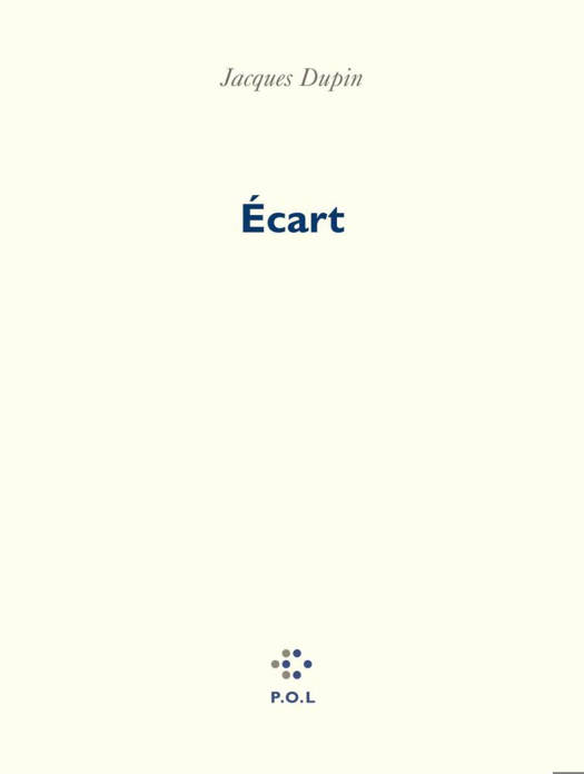 Cinq sections se partagent dans Écart le biographique de plus en plus apparent dans l'oeuvre de Jacques Dupin. Ici son enfance parmi les couleurs, les odeurs, les sensations les plus fortes et dans le mystère de parents si hauts. Son présent aussi que la maladie et la vieillesse qui meurtrit intensifient et que l'amour de la peinture exalte.