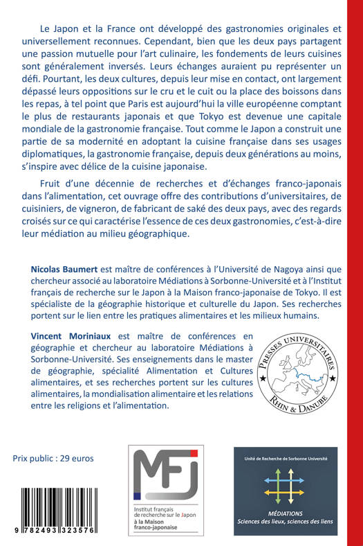 Le Japon et la France ont développé des gastronomies originales et universellement reconnues. Cependant, bien que les deux pays partagent une passion mutuelle pour l’art culinaire, les fondements de leurs cuisines sont généralement inversés. Leurs échanges auraient pu représenter un défi. Pourtant, les deux cultures, depuis leur mise en contact, ont largement dépassé leurs oppositions sur le cru et le cuit ou la place des boissons dans les repas, à tel point que Paris est aujourd’hui la ville européenne comptant le plus de restaurants japonais et que Tokyo est devenue une capitale mondiale de la gastronomie française. Tout comme le Japon a construit une partie de sa modernité en adoptant la cuisine française dans ses usages diplomatiques, la gastronomie française, depuis deux générations au moins, s’inspire avec délice de la cuisine japonaise. Fruit d’une décennie de recherches et d’échanges franco-japonais dans l’alimentation, cet ouvrage offre des contributions d’universitaires, de cuisiniers, de vigneron, de fabricant de saké des deux pays, avec des regards croisés sur ce qui caractérise l’essence de ces deux gastronomies, c’est-à-dire leur médiation au milieu géographique.