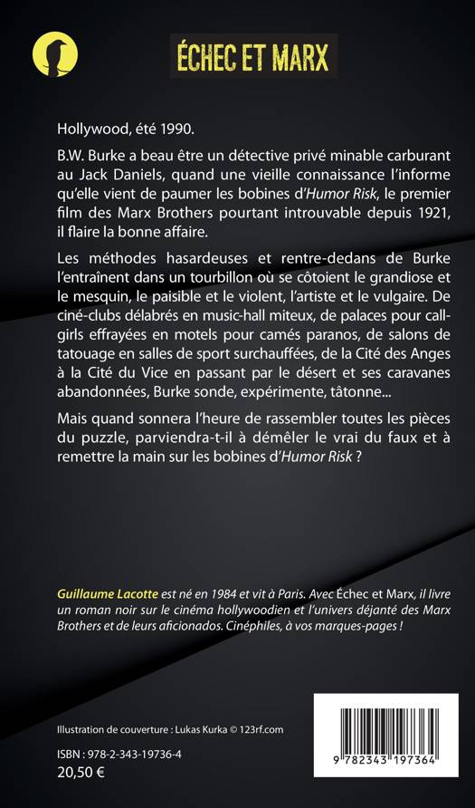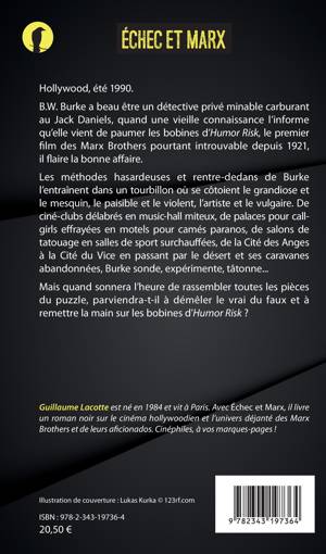 Hollywood, été 1990. B.W. Burke a beau être un détective privé minable carburant au Jack Daniels, quand une vieille connaissance l'informe qu'elle vient de paumer les bobines d'Humor Risk, le premier film des Marx Brothers pourtant introuvable depuis 1921, il flaire la bonne affaire. De ciné-clubs délabrés en music-hall miteux, de palaces pour callgirls effrayées en motels pour camés paranos, de salons de tatouage en salles de sport surchauffées, de la Cité des Anges à la Cité du Vice en passant par le désert et ses caravanes abandonnées, Burke sonde, expérimente, tâtonne. Mais quand sonnera l'heure de rassembler toutes les pièces du puzzle, parviendra-t-il à démêler le vrai du faux et à remettre la main sur les bobines d'Humor Risk ?