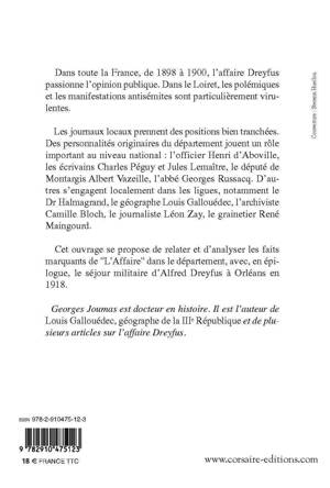 Une histoire de l'affaire Dreyfus dans le Loiret mettant en lumière la couverture de l'affaire par la presse locale, les manifestations d'antisémitisme, l'implication dans les camps pro et anti-Dreyfus de personnalités du Loiret : H. d'Abboville, premier accusateur d'A. Dreyfus, les écrivains C. Péguy et J. Lemaître, le député A. Vazeille, etc. GfK