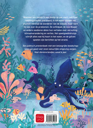 Wanneer een meisje in een bootje op zee vaart, valt haar lievelingsknuffel overboord. In het water ontdekt het pluchen inktvisje de wonderen van de oceaan, maar leert hij ook over de problemen. De schildpad, de noordkaper en andere zeedieren delen hun verhalen over vervuiling, klimaatverandering en verlies. Het speelgoedinktvisje schrijft alles wat hij hoort in het water, en de golven spoelen zijn berichten op het strand. Een poëtisch prentenboek met een belangrijke boodschap: laten we goed voor onze natuurlijke omgeving zorgen. Voor dierenvriendjes vanaf 6 jaar.