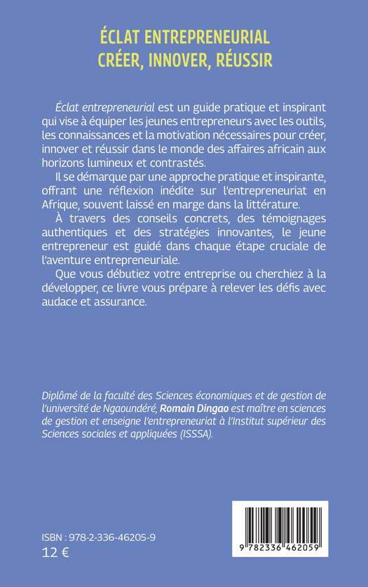 Éclat entrepreneurial est un guide pratique et inspirant qui vise à équiper les jeunes entrepreneurs avec les outils, les connaissances et la motivation nécessaires pour créer, innover et réussir dans le monde des affaires africain aux horizons lumineux et contrastés. Il se démarque par une approche pratique et inspirante, offrant une réflexion inédite sur l'entrepreneuriat en Afrique, souvent laissé en marge dans la littérature. À travers des conseils concrets, des témoignages authentiques et des stratégies innovantes, le jeune entrepreneur est guidé dans chaque étape cruciale de l'aventure entrepreneuriale. Que vous débutiez votre entreprise ou cherchiez à la développer, ce livre vous prépare à relever les défis avec audace et assurance.
