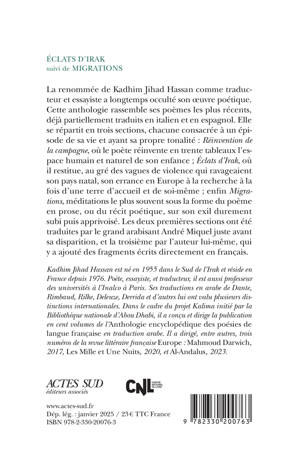 La renommée de Kadhim Jihad Hassan comme traducteur et essayiste a longtemps occulté son oeuvre poétique. Cette anthologie rassemble ses poèmes les plus récents, déjà partiellement traduits en italien et en espagnol. Elle se répartit en trois sections, chacune consacrée à un épisode de sa vie et ayant sa propre tonalité : "Réinvention de la campagne", où le poète réinvente en trente tableaux l'espace humain et naturel de son enfance ; "Éclats d'Irak", où il restitue, au gré des vagues de violence qui ravageaient son pays natal, son errance en Europe à la recherche à la fois d'une terre d'accueil et de soi-même ; enfin "Migrations, méditations" le plus souvent sous la forme du poème en prose, ou du récit poétique, sur son exil durement subi puis apprivoisé. Les deux premières sections ont été traduites par le grand arabisant André Miquel juste avant sa disparition, et la troisième par l'auteur lui-même, qui y a ajouté des fragments écrits directement en français.