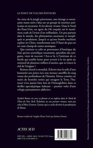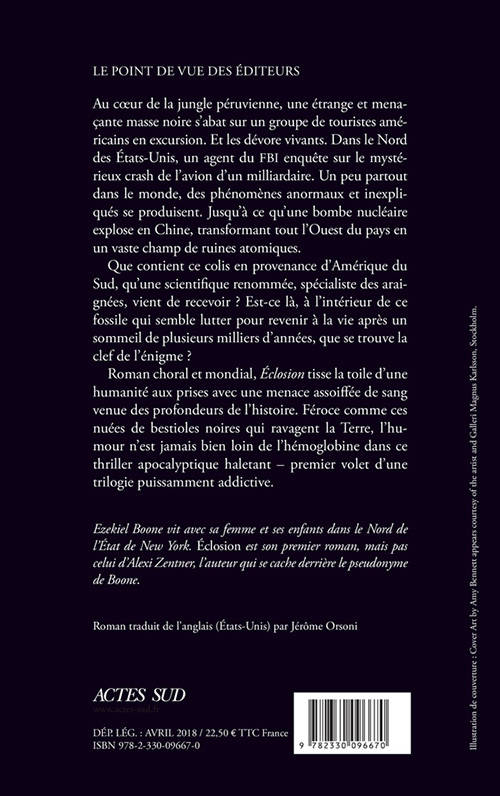 Roman choral et mondial, «Éclosion »tisse la toile d'une humanité aux prises avec une menace assoiffée de sang venue des profondeurs de l'histoire. Féroce comme ces nuées de bestioles noires qui ravagent la Terre, l'humour n'est jamais bien loin de l'hémoglobine dans ce thriller apocalyptique haletant - premier volet d'une trilogie puissamment addictive.