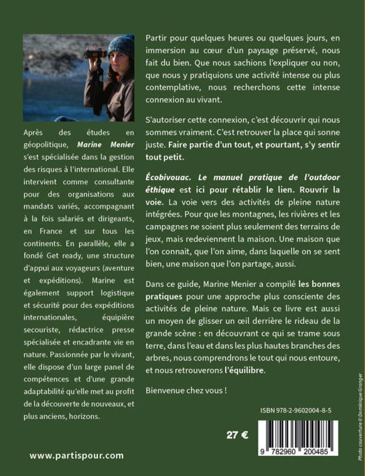 Écobivouac. Le manuel pratique de l'outdoor éthique est ici pour rétablir le lien. Rouvrir la voie. La voie vers des activités de pleine nature intégrées. Pour que les montagnes, les rivières et les campagnes ne soient plus seulement des terrains de jeux, mais redeviennent la maison. Une maison que l'on connaît, que l'on aime, dans laquelle on se sent bien, une maison que l'on partage, aussi.
