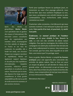 Dans ce guide, Marine Menier a compilé les bonnes pratiques pour une approche plus consciente des activités de pleine nature. Mais ce livre est aussi un moyen de glisser un oeil derrière le rideau de la grande scène : en découvrant ce qui se trame sous terre, dans l'eau et dans les plus hautes branches des arbres, nous comprendrons le tout qui nous entoure, et nous retrouverons l'équilibre.