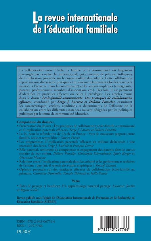 La collaboration entre l'école, la famille et la communauté est largement interrogée par la recherche internationale qui s'intéresse de près aux influences de l'implication parentale sur le cursus scolaire des enfants. Cette collaboration repose sur une diversité de pratiques et de niveaux relationnels selon les lieux et les acteurs impliqués. Ces articles examinent les caractéristiques, critères, conditions et déterminants de l'efficacité de la collaboration entre les différentes instances souvent désignées par les politiques publiques par le terme de communauté éducative.
