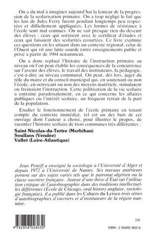 On a du mal à imaginer aujourd'hui la lenteur de la progression de la scolarisation primaire. On a trop négligé le fait que les lois de Jules Ferry furent pendant longtemps peu respectées et difficilement appliquées. Les formes de résistance à l'école sont mal connues. On ne sait presque rien du devenir des élèves : ceux qui sortaient avec le certificat d'études et ceux qui faisaient des scolarités écourtées. Ce livre examine ces questions en les situant dans un contexte régional, celui de l'Ouest qui vit une lutte sourde ·entre enseignements public et privé à partir de 1904 notamment.