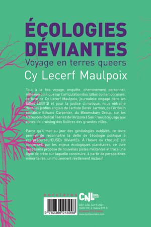Tout à la fois voyage, enquête, cheminement personnel, réflexion politique sur l'articulation des luttes contemporaines, ce livre de Cy Lecerf Maulpoix, journaliste engagé dans les luttes LGBTQI et pour la justice climatique, nous entraîne dans les jardins anglais de l'artiste Derek Jarman, de l'écrivain socialiste Edward Carpenter, du Bloomsbury Group, sur les traces des Radical Faeries de l'Arizona à San Francisco jusqu'aux zones de cruising des lisières des grandes villes. Parce qu'il met au jour des généalogies oubliées, ce texte permet de reconnaître la dette de l'écologie politique à ces précurseurEUSEs déviantEs. À l'heure où chacunE est concernéE par les enjeux écologiques planétaires, ce livre nécessaire propose de nouvelles pistes militantes et trace une ligne de crête sur laquelle construire, à partir de perspectives minoritaires, un mouvement réellement inclusif.