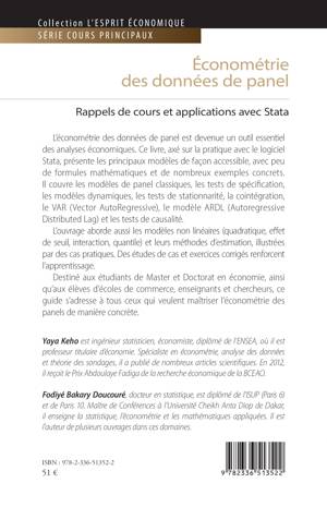 L'économétrie des données de panel est devenue un outil essentiel des analyses économiques. Ce livre, axé sur la pratique avec le logiciel Stata, présente les principaux modèles de façon accessible, avec peu de formules mathématiques et de nombreux exemples concrets. Il couvre les modèles de panel classiques, les tests de spécification, les modèles dynamiques, les tests de stationnarité, la cointégration, le VAR (Vector AutoRegressive, le modèle ARDL (Autoregressive Distributed Lag) et les tests de causalité. L'ouvrage aborde aussi les modèles non linéaires (quadratique, effet de seuil, interaction, quantile) et leurs méthodes d'estimation, illustrées par des cas pratiques. Des études de cas et exercices corrigés renforcent l'apprentissage. Destiné aux étudiants de Master et Doctorat en économie, ainsi qu'aux élèves d'écoles de commerce, enseignants et chercheurs, ce guide s'adresse à tous ceux qui veulent maîtriser l'économétrie des panels de manière concrète.