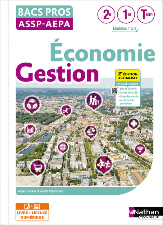 Cette pochette pour les Bacs Pros ASSP et AEPA couvre les 4 modules du programme d'Économie-Gestion, dans un format adapté au volume horaire : 1 chapitre correspond à 2 cours d'une heure.
