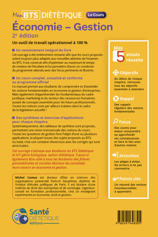 Un outil de travail opérationnel à 100 %• Un remaniement intégral du livreCet ouvrage a été entièrement remanié afin que les cours proposés soient toujours plus adaptés aux nouvelles attentes de l’examen du BTS. Il est construit afin d’optimiser au maximum le temps de révision de l’étudiant et lui permettre d’avoir un condensé du programme attendu avec des focus pertinents et illustrés.• Un cours complet, actualisé et conforme au programme officielCe manuel permet aux étudiants de comprendre et d’assimiler les notions fondamentales en économie et gestion d’entreprises. Mais également d’appréhender les fondamentaux du cadre juridique, marketing et du secteur des ressources humaines, autant de concepts essentiels pour les futurs professionnels. Toutes les notions sont par ailleurs traitées dans le cadre de la législation actuelle !• Des synthèses et exercices d’applications pour chaque chapitreSystématiquement, des tableaux de synthèse sont proposés, permettant une vision transversale des notions du cours. Toutes les questions de gestion font l’objet d’une ou plusieurs applications, la plupart issues des sujets proposés au BTS.Au total, c’est une centaine d’exercices avec les corrigés qui sont ainsi traités.Cibles :Cet ouvrage s’adresse aux étudiants du BTS Diététique et IUT génie biologique, option diététique. Il pourra également être utile à tous les étudiants des filières paramédicales et sociales désireux de consolider leurs savoirs en économie et gestion.Auteur :Michel Camus est docteur d’État en sciences des organisations (université Paris-IX Dauphine), diplômé de l’Institut d’études politiques de Paris. Il est titulaire d’une maîtrise de droit des entreprises et de sociologie. Ingénieur-conseil en formation professionnelle, c’est un enseignant expérimenté en économie, droit et gestion.