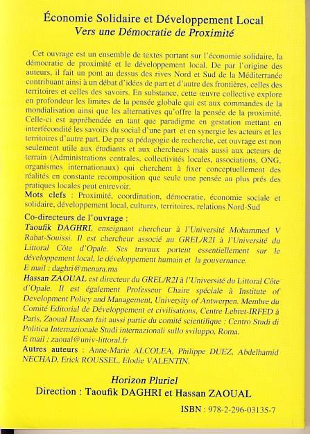 Ces contributions portent sur l'économie solidaire, la démocratie de proximité et le développement local. Elles font le pont au dessus des rives Nord et Sud de la Méditerranée, explorant en profondeur les limites de la pensée globale qui est aux commandes de la mondialisation ainsi que les alternatives qu'offre la pensée de la proximité. Celle-ci est appréhendée en tant que paradigme en gestation mettant en interfécondité les savoirs du social et en synergie les acteurs et les territoires.