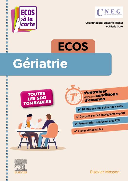 L'ouvrage ECOS Gériatrie est composé de 20 stations de la spécialité. Comme pour tous les autres ouvrages de la collection ces ECOS sont conformes aux recommandations de rédaction et de présentation de la R2C mais ne se veulent pas des références opposables. Ils ont été créés pour offrir un support d'entraînement et des opportunités pour apprendre grâce aux mises en situation pratique qu'ils proposent mais ils ne constituent pas la référence. Cet ouvrage est le fruit du travail collectif de membres du CNEG (Collège national des enseignants de gériatrie).
