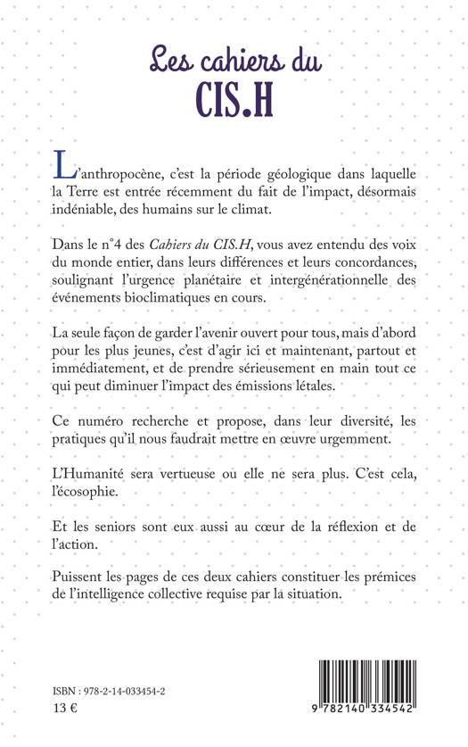 L'anthropocène, c'est la période géologique dans laquelle la Terre est entrée récemment du fait de l'impact, désormais indéniable, des humains sur le climat. Dans le n°4 des Cahiers du CIS.H, vous avez entendu des voix du monde entier, dans leurs différences et leurs concordances, soulignant l'urgence planétaire et intergénérationnelle des événements bioclimatiques en cours. La seule façon de garder l'avenir ouvert pour tous, mais d'abord pour les plus jeunes, c'est d'agir ici et maintenant, partout et immédiatement, et de prendre sérieusement en main tout ce qui peut diminuer l'impact des émissions létales. Ce numéro recherche et propose, dans leur diversité, les pratiques qu'il nous faudrait mettre en oeuvre urgemment. L'Humanité sera vertueuse ou elle ne sera plus. C'est cela, l'écosophie. Et les seniors sont eux aussi au coeur de la réflexion et de l'action. Puissent les pages de ces deux cahiers constituer les prémices de l'intelligence collective requise par la situation.