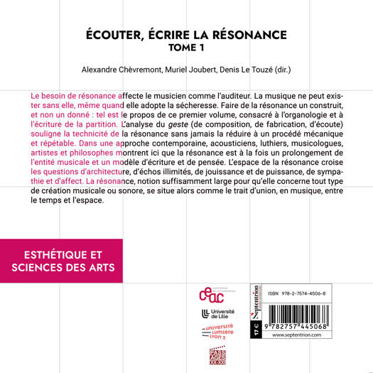 Le besoin de résonance affecte le musicien comme l’auditeur. Faire de la résonance un construit, et non un donné : tel est le propos de ce premier volume, consacré à l’organologie et à l’écriture de la partition. L’analyse du geste (de composition, de fabrication, d’écoute) souligne la technicité de la résonance sans jamais la réduire à un procédé mécanique et répétable. La résonance se situe alors comme le trait d’union, en musique, entre le temps et l’espace.