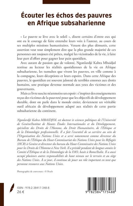 « Le pauvre se lève avec le soleil », disent certains d'entre eux qui ont eu le courage de faire entendre leurs voix à l'auteur, au cours de ses multiples missions humanitaires. Venant des plus démunis, cette assertion veut tout simplement dire que la plus grande majorité de ces personnes ont toujours été prêtes, malgré les vicissitudes de la vie, à faire leur part d'effort pour gagner leur pain quotidien. Avec autant de passion que de volonté, Ngonlardjé Kabra Mbaidjol restitue au lecteur les réalités quotidiennes de la vie en Afrique subsaharienne, les tumultes que vivent les pauvres, en ville comme à la compagne, leurs déceptions et leurs espoirs. Dans cette Afrique des pauvres, le quotidien est souvent jalonné de terribles entorses aux droits humains, une pratique devenue normale aux yeux des victimes et des gouvernants. Mais ce livre suscite néanmoins un espoir : s'inspirer des enseignements reçus des victimes de la pauvreté pour que les objectifs de développement durable, dont on parle dans le monde entier, deviennent un véritable outil africain de développement adapté aux réalités de cette partie subsaharienne du continent.