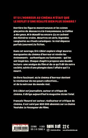 Dans cet ouvrage, Éric Libiot explore vingt œuvres marquantes du cinéma d'horreur et révèle les évènements - authentiques ou fantasmés - qui les ont inspirées. Chaque chapitre propose une double lecture : une analyse du film et de ce qu'il dit de notre société, suivie d'une plongée dans l'affaire qui l'a nourri.