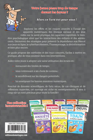 Votre jeune passe trop de temps devant les écrans ? Alors ce livre est pour vous ! Explorez les effets et les risques associés à l’usage des appareils numériques, des réseaux sociaux et des jeux vidéo sur la santé physique, les capacités cognitives, le bien-être psychologique ainsi que les interactions des enfants et des adolescents. Découvrez des stratégies pour prévenir la dépendance aux likes et aux jeux en ligne, le cyberharcèlement, l’hameçonnage, la désinformation et bien plus encore. Ce guide propose des méthodes et des trucs concrets, faciles à mettre en pratique, afin de vous soutenir dans vos interventions. Aidez votre jeune à adopter une saine utilisation des écrans en : instaurant des limites de temps ; vous intéressant à ses choix de contenu ; le sensibilisant sur les dangers potentiels ; lui enseignant les bonnes manières numériques. Ponctué de données scientifiques, de faits vécus, de cas cliniques et de réflexions nuancées, cet ouvrage est riche en renseignements. Il sera à coup sûr un outil précieux pour toute la famille !