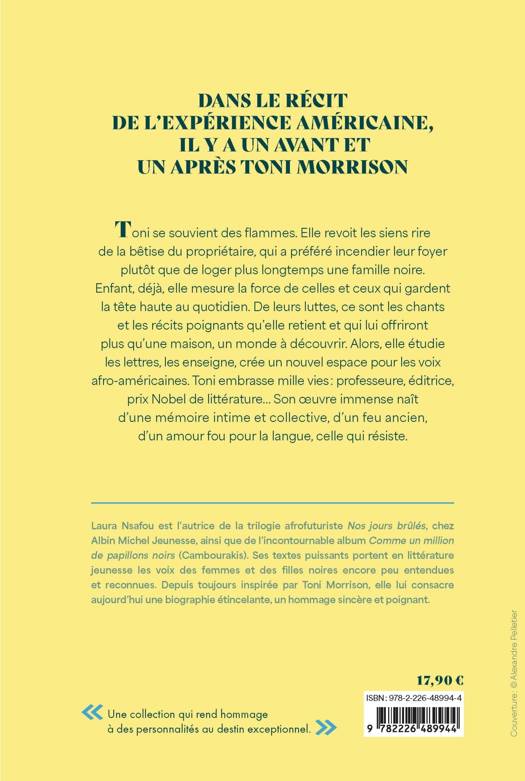 Toni se souvient des flammes. Elle revoit les siens rire de la bêtise du propriétaire, qui a préféré incendier leur foyer plutôt que de loger plus longtemps une famille noire. Enfant, déjà, elle mesure la force de celles et ceux qui gardent la tête haute au quotidien. De leurs luttes, ce sont les chants et les récits poignants qu'elle retient et qui lui offriront plus qu'une maison, un monde à découvrir. Alors, elle étudie les lettres, les enseigne, crée un nouvel espace pour les voix afro-américaines. Toni embrasse mille vies : professeure, éditrice, prix Nobel de littérature... Son oeuvre immense naît d'une mémoire intime et collective, d'un feu ancien, d'un amour fou pour la langue, celle qui résiste.