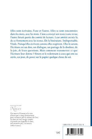 Il y a les blessures et il y a la blessure Elles sont écrivains, l'une et l'autre. Elles se sont rencontrées dans les mots, avec les mots. L'une a envoyé son texte à une revue, l'autre faisait partie du comité de lecture. Leur amitié est née là, de ce frottement avec les textes. De la littérature. Indispensable. Vitale. Puisqu'elles écrivent comme elles respirent. Elles le savent, l'écriture est un don, un dialogue, un partage de la douleur, de la joie, de leurs questions. Mais comment transmettre ce que l'écriture leur donne ? Sinon en le redonnant à ceux qui ont eu envie, un jour, de poser sur le papier quelque chose de soi. Le recueil est divisé en quatre parties : l'introduction, des conversations entre les deux auteures sur différents thèmes et enfin une annexe.