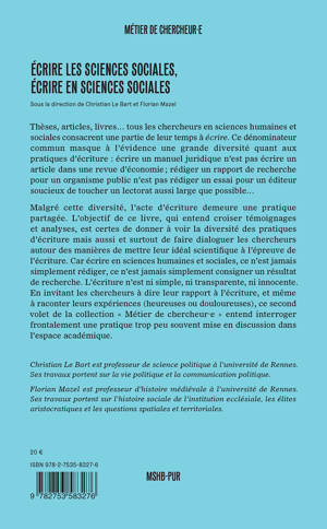 Thèses, articles, livres... tous les chercheurs en sciences humaines et sociales consacrent une partie de leur temps à écrire. Ce dénominateur commun masque à l'évidence une grande diversité quant aux pratiques d'écriture. En invitant les chercheurs à dire leur rapport à l'écriture, et même à raconter leurs expériences (heureuses ou douloureuses), ce second volet de la collection « Métier de chercheur·e » entend interroger frontalement une pratique trop peu souvent mise en discussion dans l'espace académique.