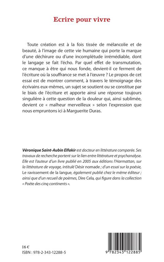Toute création est à la fois tissée de mélancolie et de beauté, à l'image de cette vie humaine qui porte la marque d'une déchirure ou d'une incomplétude dont le langage se fait l'écho. Par quel effet de transmutation, ce manque à être qui nous fonde devient-il ce ferment de l'écriture où la souffrance se met à l'uvre ? Le propos de cet essai est de montrer comment, à travers le témoignage des écrivains eux-mêmes, un sujet se soutient ou se constitue par le biais de l'écriture et apporte une réponse toujours singulière à cette question de la douleur.