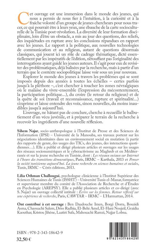 De jeunes chercheurs nous invitent dans cet ouvrage à penser des questions qu'ils estiment prioritaires et d'actualité, relatives aux conditions de la jeunesse en Tunisie, traçant ce qui ce qui pourrait être à leurs yeux une ébauche de la carte socioculturelle de la Tunisie post-révolution. Les problématiques traitées s'articulent autour de deux axes thématiques : le premier concerne les jeunes et les rapports aux institutions ; le deuxième porte sur les jeunes et les débats de société dans les médias et sur les réseaux socionumériques. Il s’agit pour ces chercheurs de revisiter des problématiques, déjà balisées par la recherche, mais à partir d’un terrain que le contexte sociopolitique laisse voir sous un jour nouveau.