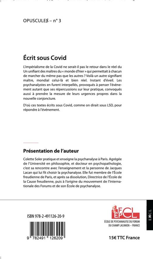 L'impérialisme de la Covid ne serait-il pas le retour dans le réel du Un unifiant des maîtres du "monde d'hier", qui permettait à chacun de marcher du même pas que les autres ? Voilà un autre signifiant maître, mondial celui-là et bien réel. Instant d'éveil. Les psychanalystes en furent interpellés, provoqués à penser l'évènement autant que ses répercussions sur leur pratique, convoqués aussi à prendre la mesure de leurs urgences propres dans la nouvelle conjoncture.<br /> D'où ces textes écrits sous Covid, comme on dirait sous LSD, pour répondre à l'événement