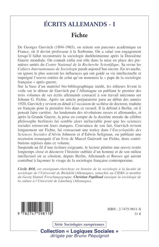 De Georges Gurvitch, on retient son parcours académique en France, où il devient professeur à la Sorbonne. On a salué son engagement lorsqu'il fallut reconstruire la sociologie durkheimienne après la Deuxième Guerre Mondiale. On connaît enfin son rôle dans la mise en place des premières unités du Centre National de la Recherche Scientifique. Sa revue Les Cahiers Internationaux de Sociologie paraît aujourd'hui encore. En revanche, on ignore le plus souvent les influences qui ont guidé sa vie intellectuelle . Le premier des 3 volumes de ses écrits allemands est consacré à son travail méconnu sur Johann G. Fichte.
