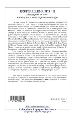 Ce second volume des écrits allemands de Georges Gurvitch (1894-1965) comporte les travaux que l'auteur a dédiés à la philosophie du droit, la philosophie sociale ainsi qu'à la phénoménologie qu'il fut l'un des premiers à introduire en France. Ces textes révèlent la permanence des thématiques fichtéennes et plus généralement de la tradition allemande dans les travaux de Gurvitch. Ils attestent également de son effort pour établir une synthèse critique de traditions philosophiques, au profit d'une science de la morale pratique dont il cherchait les sources européennes.