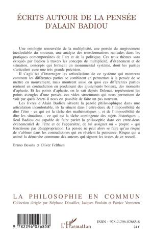 Il s'agit ici d'interroger les articulations du système construit par Alain Badiou autour de trois concepts fondamentaux, la multiplicité, dont il renouvelle l'ontologie, l'événement, qui le conduit à forger une pensée du surgissement incalculable du nouveau, et la situation, occasion d'une analyse des transformations radicales dans les pratiques contemporaines de l'art et de la politique.