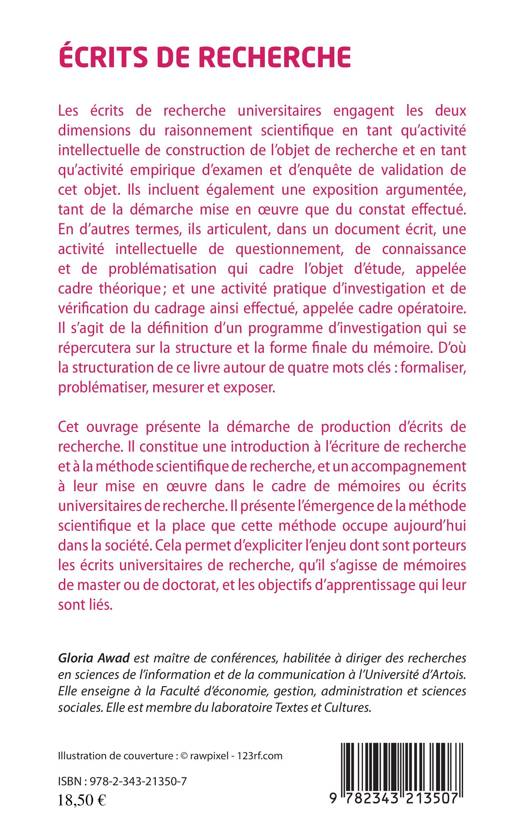 Les écrits de recherche universitaires articulent, dans un document écrit, une activité intellectuelle de questionnement, de connaissance et de problématisation qui cadre l'objet d'étude, appelée cadre théorique; et une activité pratique d'investigation et de vérification du cadrage ainsi effectué, appelée cadre opératoire. Cet ouvrage présente la démarche de production d'écrits de recherche. Il constitue une introduction à l'écriture de recherche et à la méthode scientifique de recherche, et un accompagnement à leur mise en oeuvre dans le cadre de mémoires ou écrits universitaires de recherche.