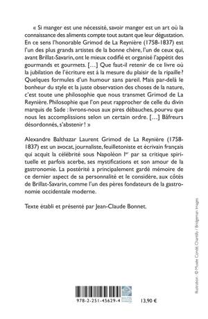 « Si manger est une nécessité, savoir manger est un art où la connaissance des aliments compte tout autant que leur dégustation. En ce sens l’honorable Grimod de La Reynière (1758-1837) est l’un des plus grands artistes de la bonne chère, l’un de ceux qui, avant Brillat-Savarin, ont le mieux codifié et organisé l’appétit des gourmands et gourmets. […] Que faut-il retenir de ce livre où la jubilation de l’écriture est à la mesure du plaisir de la ripaille ? Quelques formules d’un humour sans pareil. Mais par-delà le bonheur du style et la juste observation des choses de la nature, c’est toute une philosophie que nous transmet Grimod de La Reynière. Philosophie que l’on peut rapprocher de celle du divin marquis de Sade : livrons-nous aux pires débauches, pourvu que nous les accomplissions selon un certain ordre. […] Bâfreurs désordonnés, s’abstenir ! »