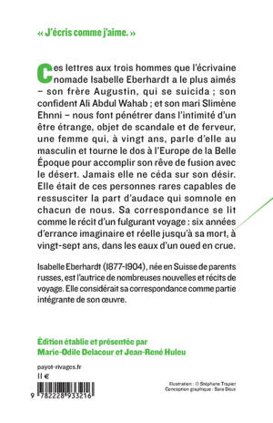 Ces lettres aux trois hommes que l'écrivaine nomade Isabelle Eberhardt a le plus aimés - son frère Augustin, qui se suicida ; son confident Ali Abdul Wahab ; et son mari Slimène Ehnni - nous font pénétrer dans l'intimité d'un être étrange, objet de scandale et de ferveur, une femme qui, à vingt ans, parle d'elle au masculin et tourne le dos à l'Europe de la Belle Époque pour accomplir son rêve de fusion avec le désert. Jamais elle ne céda sur son désir. Elle était de ces personnes rares capables de ressusciter la part d'audace qui somnole en chacun de nous. Sa correspondance se lit comme le récit d'un fulgurant voyage : six années d'errance imaginaire et réelle jusqu'à sa mort, à vingt-sept ans, dans les eaux d'un oued en crue.
