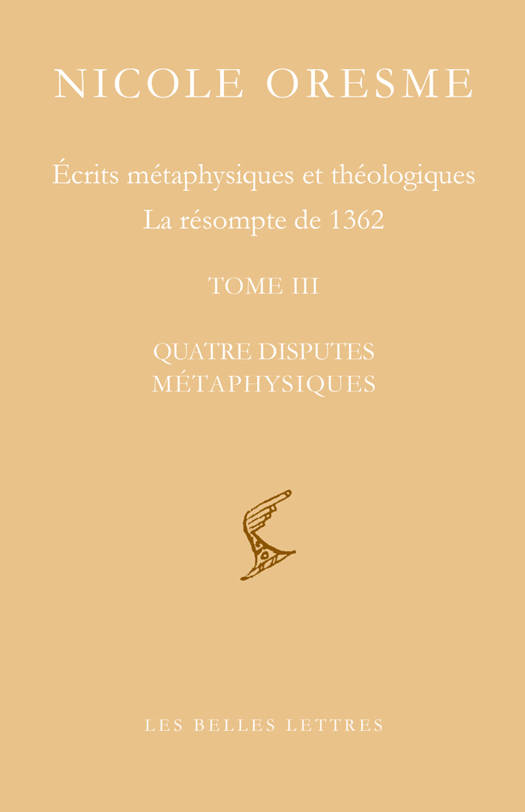 Voici le texte de quatre disputes metaphysiques de Nicole Oresme: Le Developpement des especes, L'Amelioration de l'univers, Les Lignes graduelles des etres et La Circulation des proprietes divines. Elles sont presentes dans le manuscrit Vat. Lat. 986, gros recueil des questions soulevees et debattues lors de la seance finale de son parcours en theologie, sa resompte de 1362, qui a fait l'objet des deux premiers tomes de cette serie. Trois des disputes sont inedites et la quatrieme est publiee dans une version plus ancienne. Toutes meritaient une lecture attentive: elles participent en effet a la naissance d'une metaphysique laique, a peu pres contemporaine, en des termes bien differents, de l'instauration d'une metaphysique chretienne. Et precisement, la confrontation des deux metaphysiques est au coeur de ces disputes. Leur originalite tient a la volonte d'Oresme de loger des analyses laiques de la structure du monde dans un cadre theologique, ou, dans le quatrieme texte, de donner une lecture naturaliste d'un dogme chretien. Il utilisait alors sa science des proportions et sa pratique d'un modele geometrique, tout et en reflechissant sur le role de l'infini et du continu dans l'univers.