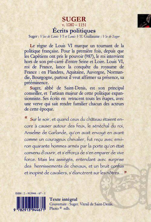 Le volume comprend : l'Histoire du roi Louis VI le Gros ; l'Histoire du roi Louis VII le Jeune. Ecrites par Suger. Suivi par La Vie de Suger, écrite par Guillaume le moine. Traduction originale F. Guizot. Edition Romain Fougères. Texte intégral.