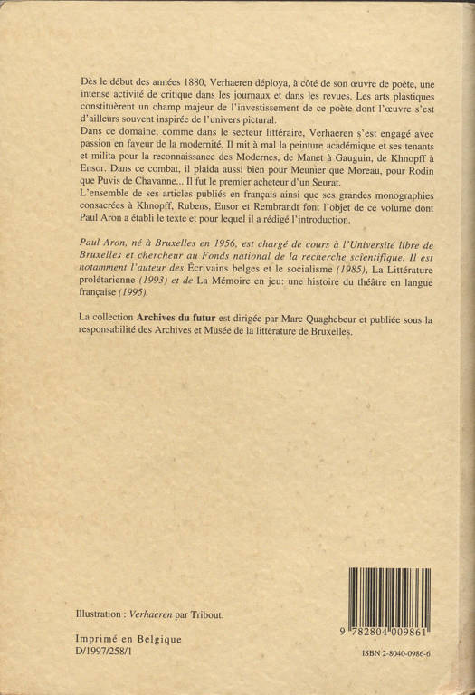 "Dès le début des années 1880, Verhaeren déploya, à côté de son œuvre de poète, une intense activité de critique dans les journaux et dans les revues. Les arts plastiques constituèrent un champ majeur de l’investissement de cet écrivain dont l’œuvre s’est souvent inspirée de l’univers pictural et révèle une grande puissance visuelle. L’ensemble des critiques d’art publiées en français ainsi que les grandes monographies consacrées à Khnopff, Rubens, Ensor et Rembrandt font l’objet de ce volume. Sous coffret."
