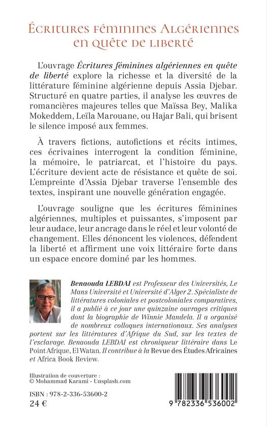 L'ouvrage Écritures féminines algériennes en quête de liberté explore la richesse et la diversité de la littérature féminine algérienne depuis Assia Djebar. Structuré en quatre parties, il analyse les oeuvres de romancières majeures telles que Maïssa Bey, Malika Mokeddem, Leïla Marouane, ou Hajar Bali, qui brisent le silence imposé aux femmes. À travers fictions, autofictions et récits intimes, ces écrivaines interrogent la condition féminine, la mémoire, le patriarcat, et l'histoire du pays. L'écriture devient acte de résistance et quête de soi. L'empreinte d'Assia Djebar traverse l'ensemble des textes, inspirant une nouvelle génération engagée. L'ouvrage souligne que les écritures féminines algériennes, multiples et puissantes, s'imposent par leur audace, leur ancrage dans le réel et leur volonté de changement. Elles dénoncent les violences, défendent la liberté et affirment une voix littéraire forte dans un espace encore dominé par les hommes.