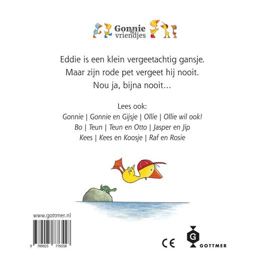 Eddie is een klein gansje dat nog wel eens iets vergeet. Zelfs als mama gans hem eraan herinnert. Soms vergeet hij zijn nest op te ruimen of zijn dutje te doen. Soms vergeet hij binnen te komen als het regent. Maar wat hij nooit vergeet, is zijn rode pet. Die draagt hij altijd. Toch?