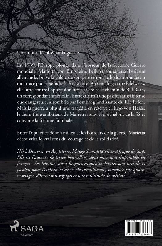 Un amour déchiré par la guerre. En 1939, l'Europe plonge dans l'horreur de la Seconde Guerre mondiale. Marietta von Burgheim, belle et courageuse héritière allemande, brave la colère de son père et tourne le dos à son destin tout tracé pour rejoindre la Résistance. Au sein du groupe Edelweiss, elle lutte contre l'oppression nazie et croise le chemin de Bill Roth, un correspondant américain. Entre eux naît une passion aussi intense que dangereuse, assombrie par l'ombre grandissante du IIIe Reich. Mais la guerre a plus d'une tragédie en réserve : Hugo von Hesse, le demi-frère ambitieux de Marietta, gravit les échelons de la SS et convoite la fortune familiale. Entre l'opulence de son milieu et les horreurs de la guerre, Marietta découvrira le vrai sens du courage et de la solidarité.