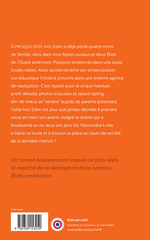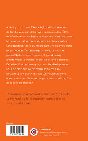À PRESQUE SEIZE ANS, Eden a déjà porté quatre noms de famille, vécu dans trois foyers sociaux et deux États de l'Ouest américain. Plusieurs existences dans une seule, toutes ratées. Alors qu'elle réclame son émancipation, son éducateur l'incite à s'inscrire dans une énième agence de réadoption. C'est reparti pour le cirque habituel : profil détaillé, photos enjouées et speed-dating, afin de mieux se "vendre" auprès de parents potentiels. Cette fois, Eden est plus que jamais décidée à prendre seule en main son avenir, malgré le drame qui a bouleversé sa vie deux ans plus tôt. Parviendra-t-elle à tracer sa route et à trouver sa place au cours de cet été de la dernière chance ?