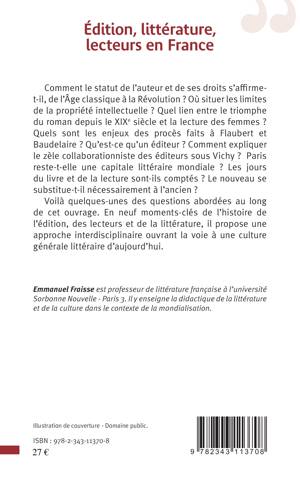 Comment le statut de l'auteur et de ses droits s'affirme-t-il, de l'Âge classique à la Révolution? Où situer les limites de la propriété intellectuelle? Quel lien entre le triomphe du roman depuis le XIXe siècle et la lecture des femmes? Quels sont les enjeux des procès faits à Flaubert et Baudelaire. Qu'est-ce qu'un éditeur? Comment expliquer le zèle collaborationniste des éditeurs sous Vichy? Paris reste-elle une capitale littéraire mondiale? Les jours du livre et de la lecture sont-ils comptés? L'auteur propose une approche interdisciplinaire ouvrant la voie à une culture générale littéraire d'aujourd'hui.