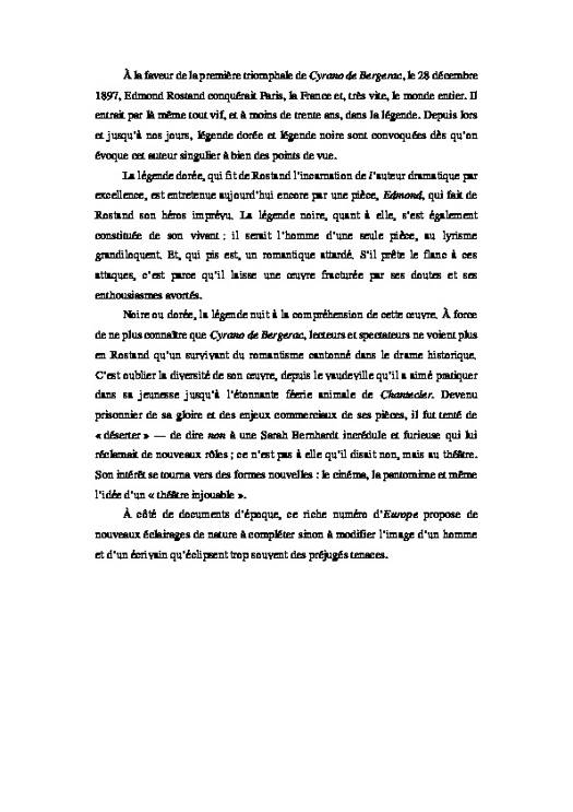 À la faveur de la première triomphale de Cyrano de Bergerac, le 28 décembre 1897, Edmond Rostand conquérait Paris, la France et, très vite, le monde entier.Il entrait par là même tout vif, et à moins de trente ans, dans la légende. Depuis lors et jusqu'à nos jours, légende dorée et légende noire sont convoquées dès qu'on évoque cet auteur singulier à bien des points de vue. La légende dorée, qui fit de Rostand l'incarnation de l'auteur dramatique par excellence, est entretenue aujourd'hui encore par une pièce, Edmond, qui fait de Rostand son héros imprévu. La légende noire, quant à elle, s'est également constituée de son vivant : il serait l'homme d'une seule pièce, au lyrisme grandiloquent. Et, qui pis est, un romantique attardé. S'il prête le flanc à ces attaques, c'est parce qu'il laisse une oeuvre fracturée par ses doutes et ses enthousiasmes avortés. Noire ou dorée, la légende nuit à la compréhension de cette oeuvre. À force de ne plus connaître que Cyrano de Bergerac, lecteurs et spectateurs ne voient plus en Rostand qu'un survivant du romantisme cantonné dans le drame historique.C'est oublier la diversité de son oeuvre, depuis le vaudeville qu'il a aimé pratiquer dans sa jeunesse jusqu'a l'étonnante féerie animale de Chantecler. Devenu prisonnier de sa gloire et des enjeux commerciaux de ses pièces, Rostand fut tenté de « déserter » - de dire non à une Sarah Bernhardt incrédule et faneuse qui lui réclamait de nouveaux rôles ; ce n'est pas à elle qu'il disait non, mais au théâtre. Son intérêt se tourna vers des formes nouvelles : le cinéma, la pantomime et même l'idée d'un « théâtre injouable ». À côté de documents d'époque, ce riche numéro d'Europe propose de nouveaux éclairages de nature à compléter sinon à modifier l'image d'un homme et d'un écrivain qu'éclipsent trop souvent des préjugés tenaces.
