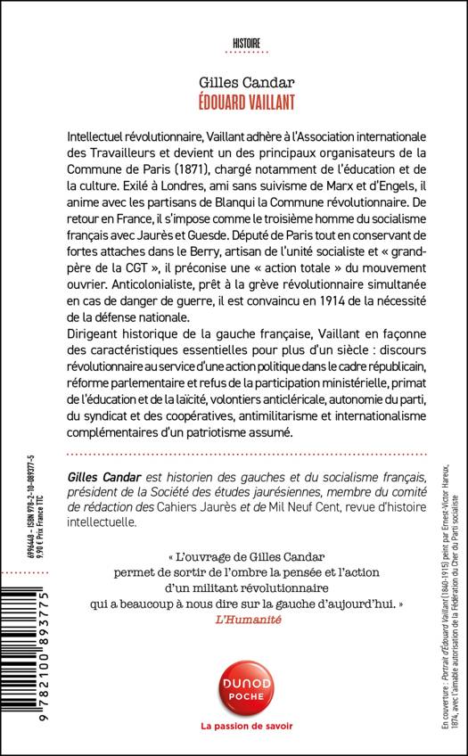 Intellectuel révolutionnaire, Vaillant adhère à l’Association internationale des Travailleurs et devient un des principaux organisateurs de la Commune de Paris (1871), chargé notamment de l’éducation et de la culture. Exilé à Londres, ami sans suivisme de Marx et d’Engels, il anime avec les partisans de Blanqui la Commune révolutionnaire. De retour en France, il s’impose comme le troisième homme du socialisme français avec Jaurès et Guesde. Député de Paris tout en conservant de fortes attaches dans le Berry, artisan de l’unité socialiste et « grand-père de la CGT », il préconise une « action totale » du mouvement ouvrier. Anticolonialiste, prêt à la grève révolutionnaire simultanée en cas de danger de guerre, il est convaincu en 1914 de la nécessité de la défense nationale. Dirigeant historique de la gauche française, Vaillant en façonne des caractéristiques essentielles pour plus d’un siècle : discours révolutionnaire au service d’une action politique dans le cadre républicain, réforme parlementaire et refus de la participation ministérielle, primat de l’éducation et de la laïcité, volontiers anticléricale, autonomie du parti, du syndicat et des coopératives, antimilitarisme et internationalisme complémentaires d’un patriotisme assumé.