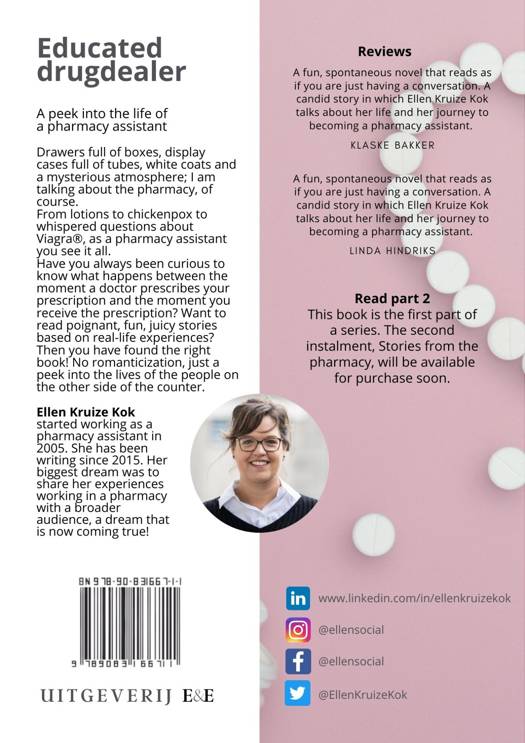 A fun, spontaneous novel that reads as if you are just having a conversation. A candid story in which Ellen Kruize Kok talks about her life and her journey to becoming a pharmacy assistant. Linda Hindriks